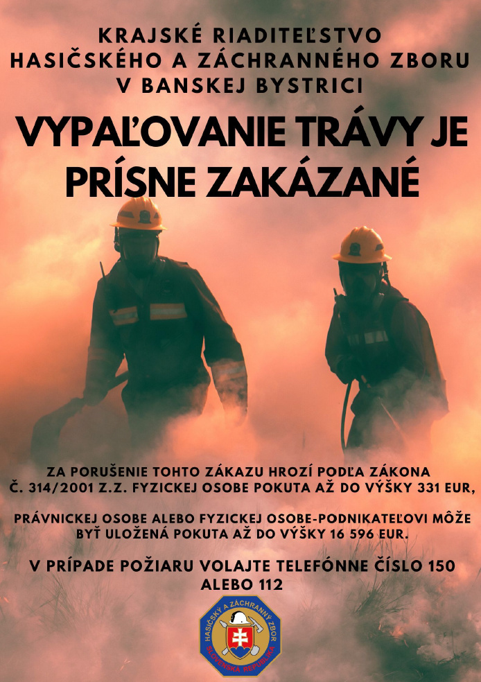 Upozorňujeme občanov, že v čase zvýšeného nebezpečenstva vzniku požiarov, počas suchého a teplého počasia budú príslušníci Okresného riaditeľstva Hasičského a záchranného zboru a príslušníci Okresného riaditeľstva Policajného zboru vykonávať hliadkovú činnosť zameranú na odhalenie prípadov vypaľovania porastov trávy a kríkov.